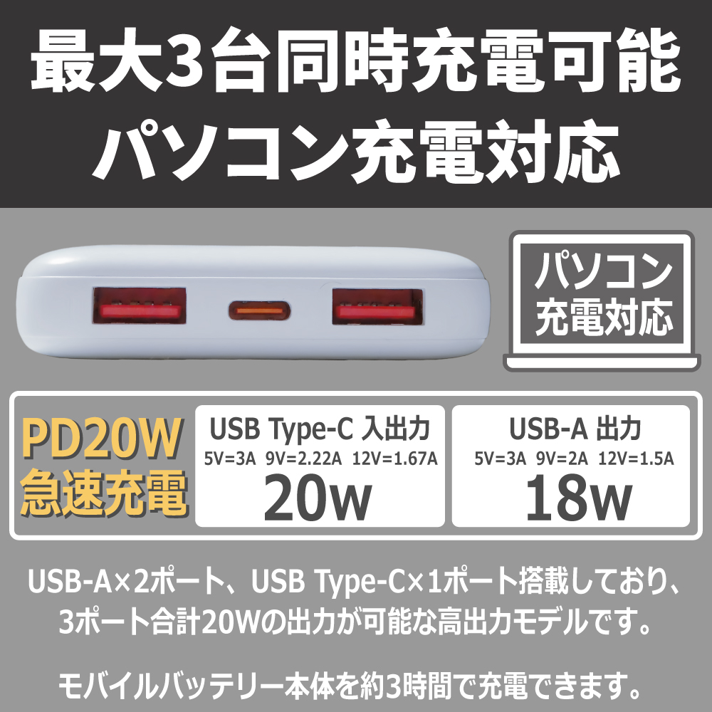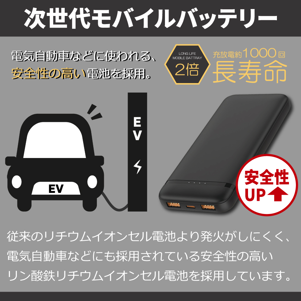 モバイルバッテリー リン酸鉄 10000mAh 急速充電 PD20W 3台同時充電 長寿命1000回以上サイクル 高い安全性 リン酸鉄バッテリー 軽量 薄型 Type-C×1 USB-A×2 iPhone/Android/iPad 全機種対応 日本語取扱説明書 停電対策 PSE認証済